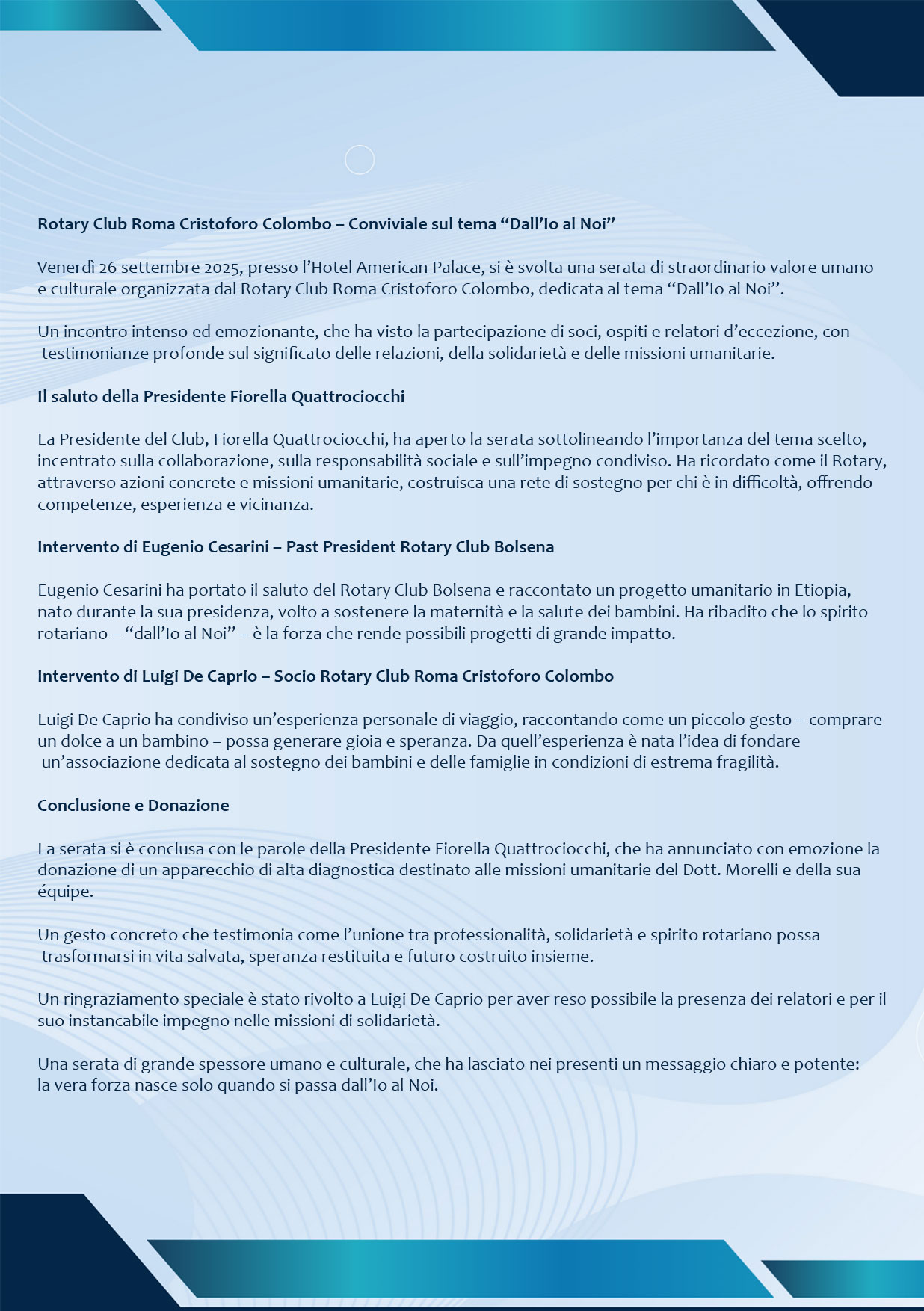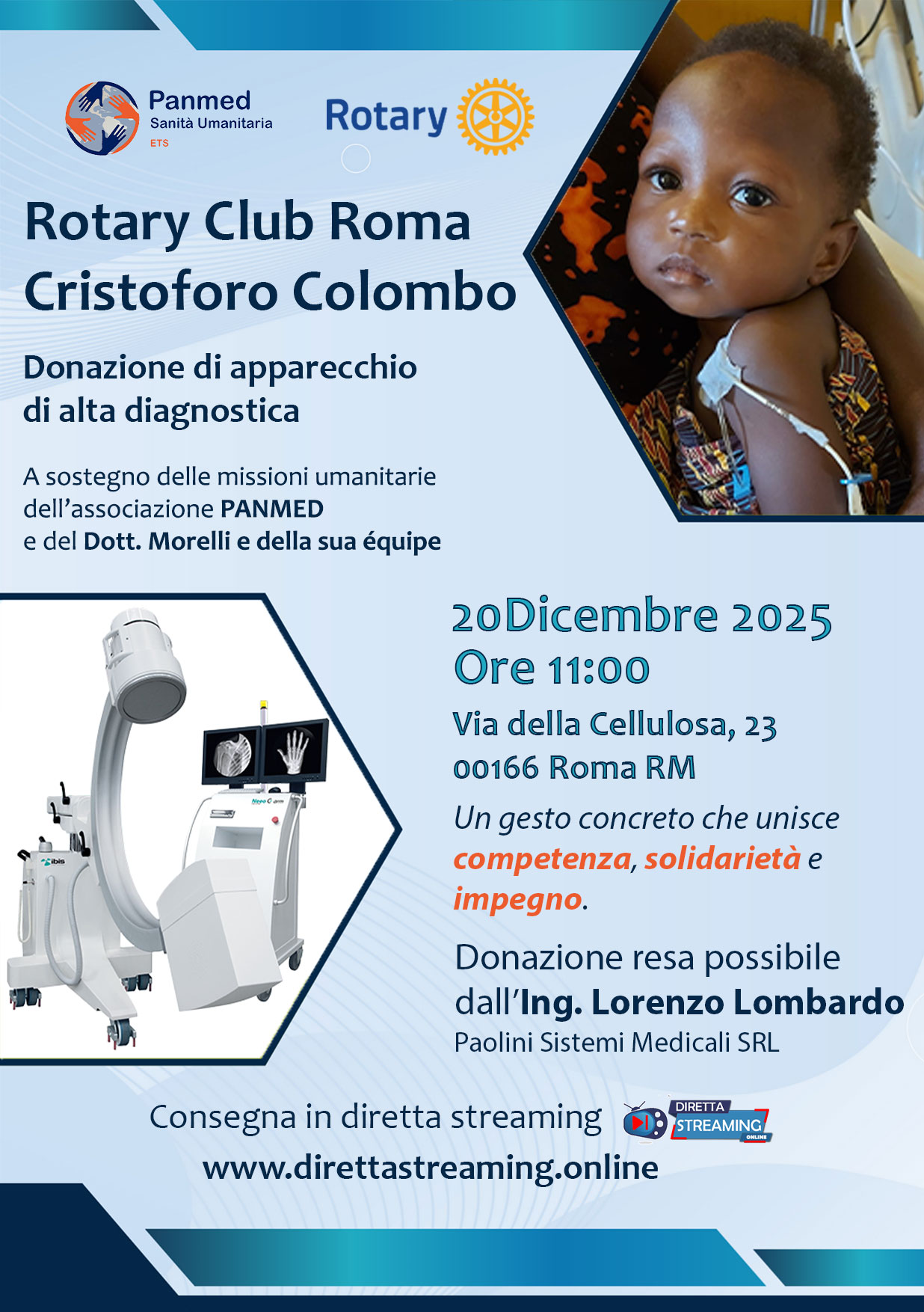 Il 20 dicembre, il Rotary Club Roma Cristoforo Colombo promuove un importante evento di solidarietà dedicato alla donazione di un apparecchio di alta diagnostica, destinato alle missioni umanitarie dell’associazione PANMED, guidata dal Dott. Morelli e dalla sua équipe. La donazione è resa possibile grazie alla generosità dell’Ingegnere Lorenzo Lombardo e di Paolini Sistemi Medicali S.r.l., che hanno messo a disposizione competenze e risorse con l’obiettivo di contribuire concretamente al miglioramento delle cure sanitarie nei contesti più fragili. La consegna ufficiale del macchinario rappresenta un momento di grande valore umano e professionale, esempio concreto di come la collaborazione tra il mondo del volontariato, della sanità e dell’impresa possa trasformarsi in un’azione capace di generare impatto reale. Questa cerimonia rappresenta molto di più di una semplice consegna di un macchinario. Non è solo un atto tecnico, ma la realizzazione di un sogno che dimostra come la salute non abbia confini. Fin dal 1905, il Rotary trasforma le relazioni umane in azioni concrete: oggi, questo macchinario ad alta definizione diventa un ponte di speranza tra noi e l'Eritrea. Seguendo il motto "United for Good", abbiamo unito le forze con PanMed perché crediamo che solo insieme si possano compiere grandi opere. Consegniamo questa tecnologia alla sala operatoria africana come segno del nostro impegno: e ci piace immaginare che dove c'è un bisogno, lì ci sarà sempre la mano tesa del Rotary.